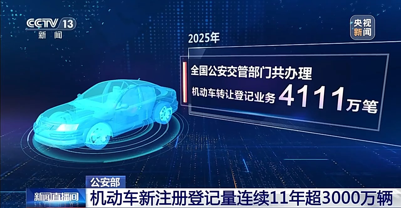 在二手车交易方面,公安部会同商务部等部门推出便利异地交易登记等系列改革措施,更好促进二手车流通。2025年,全国公安交管部门共办理机动车转让登记业务4111万笔。自2020年以来,全国二手汽车交易登记量已连续6年超过汽车新车注册登记量。2025年,各地公安交管部门积极推行补换领牌证等交管业务“足不出户”网上办,全国网上办理补换领驾驶证行驶证、发放临时号牌等业务1.16亿次。另外,2025年11月1日公安部全面推行国产小客车新车上牌“一件事”以来,已有20万车主通过“交管12123”App办理国产小客车注册登记。
