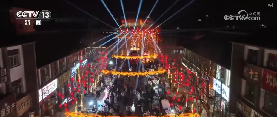 夜幕降临,河北张家口涿鹿县鼓楼北街灯火璀璨、人流如织。街道两侧大红灯笼、串串彩灯寄托着美好祝愿。各种年货摆满摊位,吸引不少消费者前来选购。