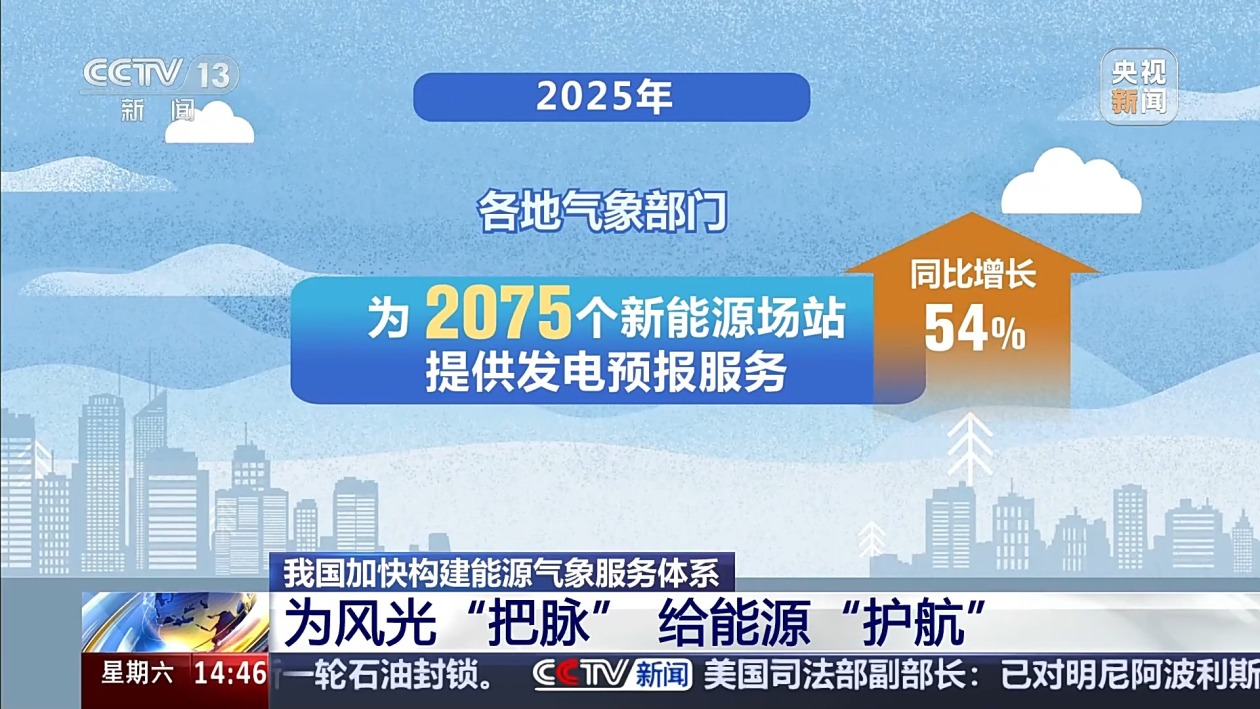据统计,2025年,各地气象部门已为2075个新能源场站提供发电预报服务,同比增长54%;为近2700个场站提供防雷、预警等服务;为659个水电站提供气象保障。