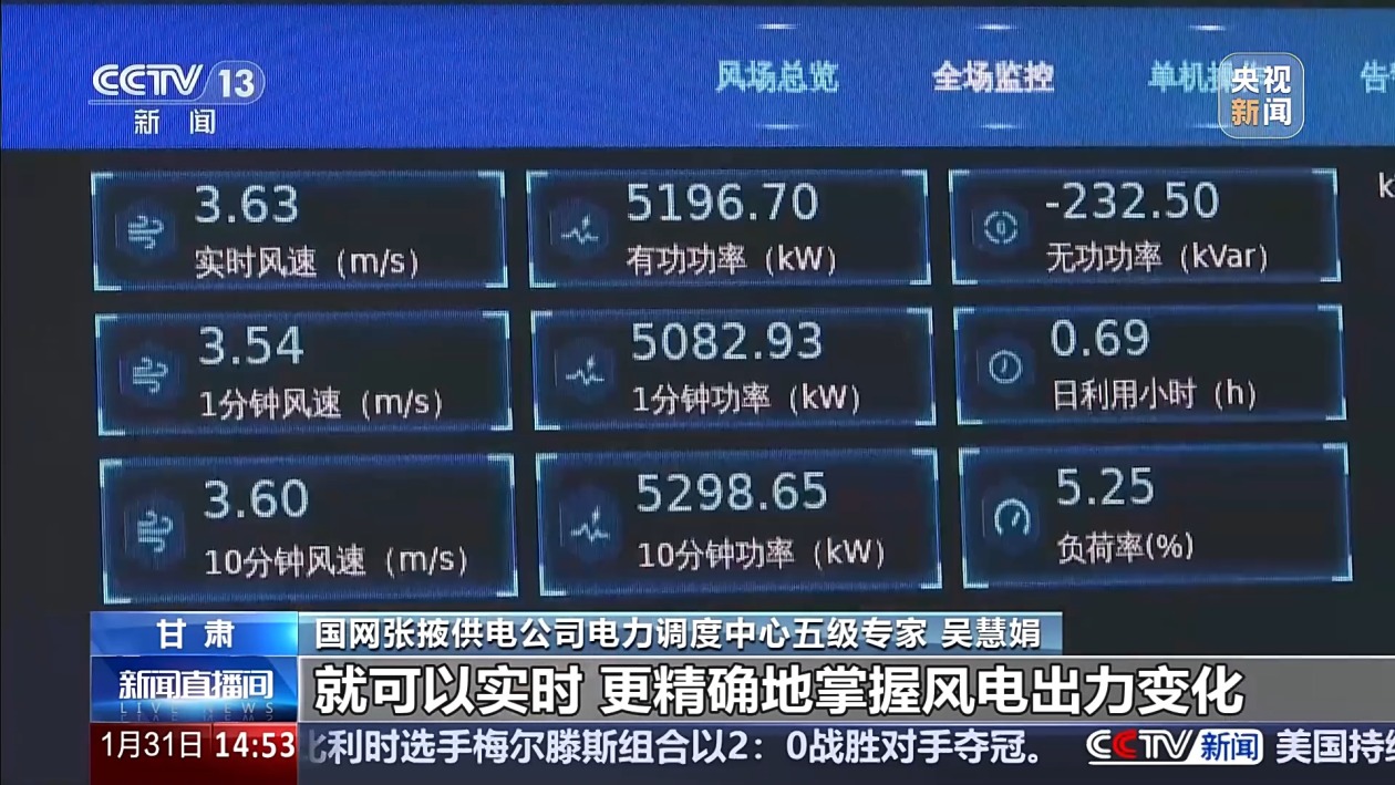 国网张掖供电公司电力调度中心五级专家 吴慧娟:提升功率预测的准确率,就可以实时更精确地掌握风电的出力变化,便于我们及时调用其他的电源来进行补偿发电。