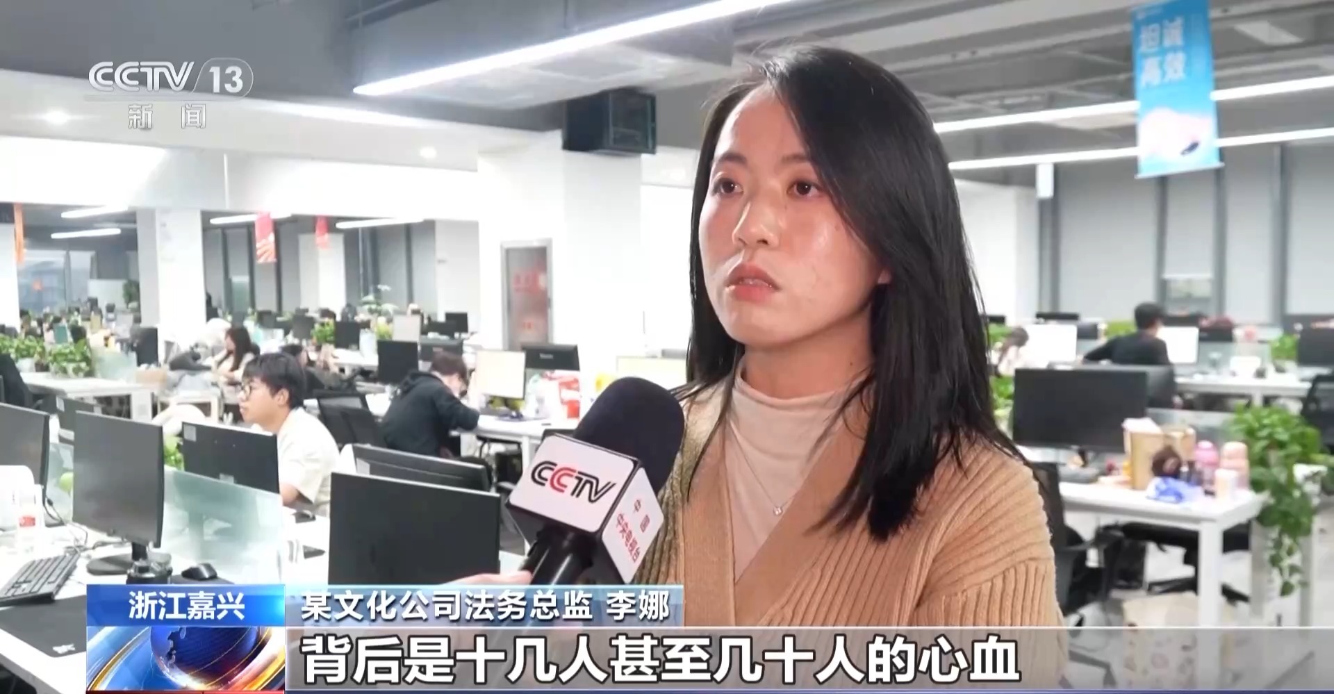 某文化公司法务总监 李娜:我们自己的这个短文,从选题到创作到推广发行,背后是十几人甚至几十人的心血 。面对这种零成本的掠夺,我们团队的创作热情受到了极大打击,当时就把这个线索传递给了嘉兴市公安局的知产警官。