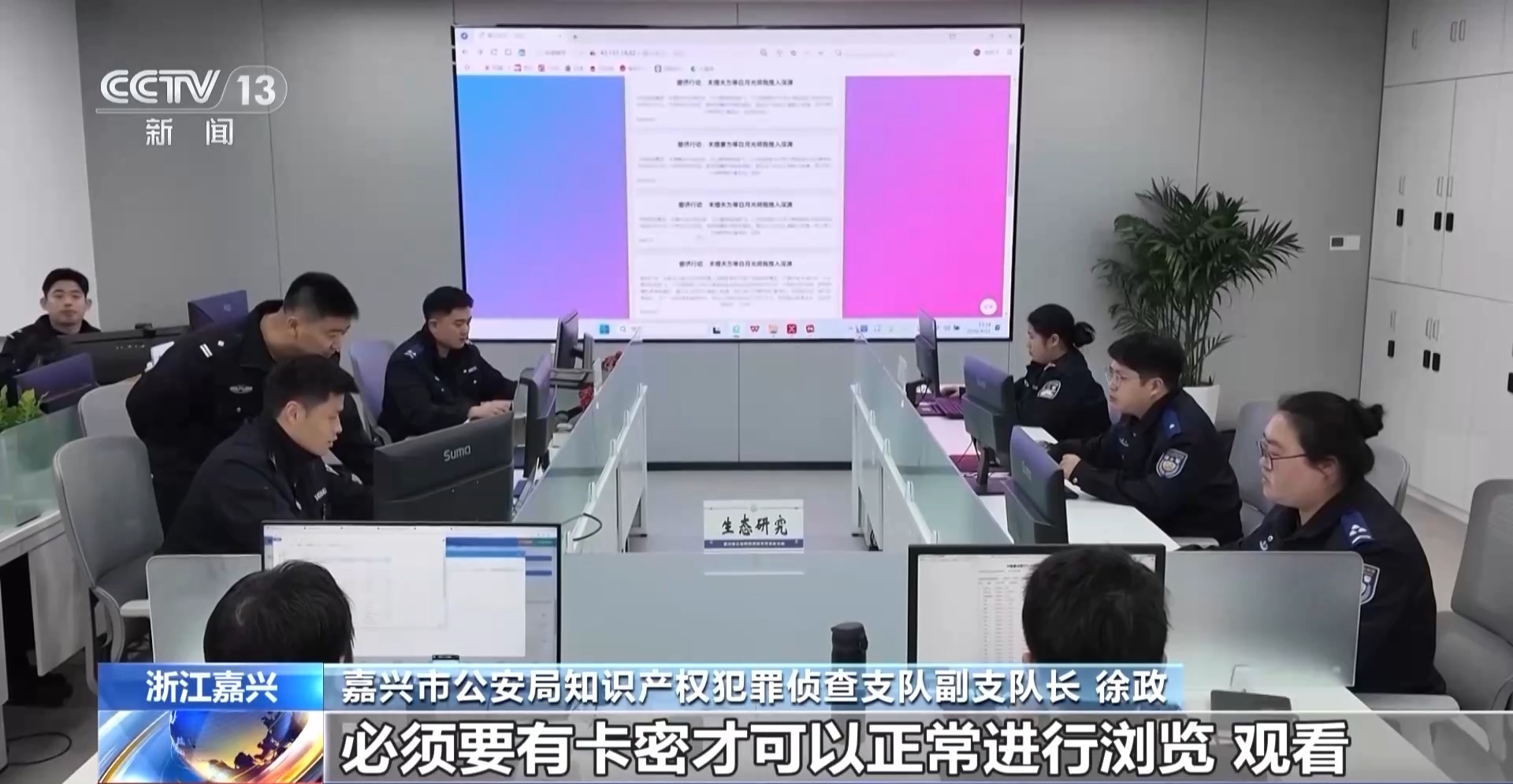 嘉兴市公安局知识产权犯罪侦查支队副支队长 徐政:我们发现这个盗版网站必须要有卡密才可以正常浏览、观看,卡密是通过一家网络店铺进行销售的。我们就围绕网络店铺开展侦查,经过研判发现,盗版网站非法传播的作品数量非常多,网络店铺涉案的金额也是巨大的,涉嫌侵犯著作权的犯罪。