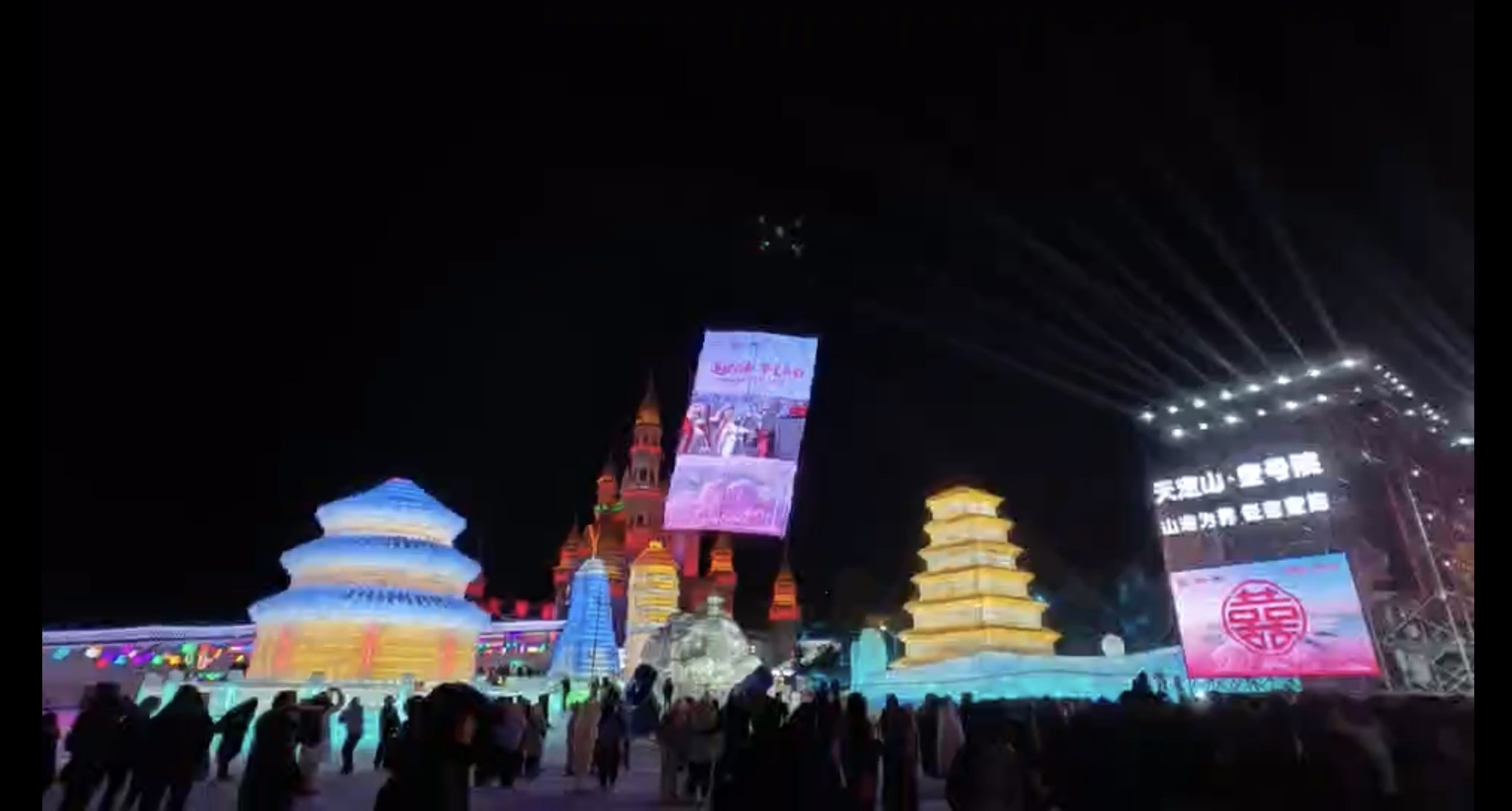 活动现场,冰天雪地化身为天然幕布,科技光影则成为点睛之笔。搭载高清LED大屏的无人机群平稳升空,在零下严寒中精准悬停,循环播放着爱情主题列车的宣传片。空中大屏画面清晰、色彩鲜亮,与地面举行的14对新人集体婚礼、晶莹剔透的冰雕景观,以及璀璨绽放的烟花秀交相辉映,构建出一幅立体化的浪漫画卷。这一极具未来感的传播方式迅速吸引了现场游客的目光,大家纷纷驻足拍摄并刷屏分享,让科技之美定格浪漫瞬间,实现了品牌传播与文旅场景的完美融合。