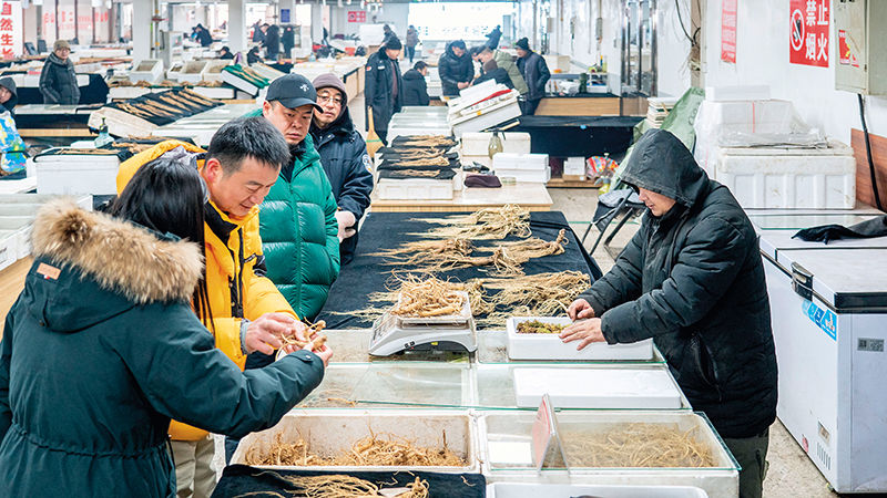 在吉林省抚松县的长白山人参交易市场内,顾客在选购人参(2025 年 1 月 15 日摄) 唐成卓摄 / 本刊